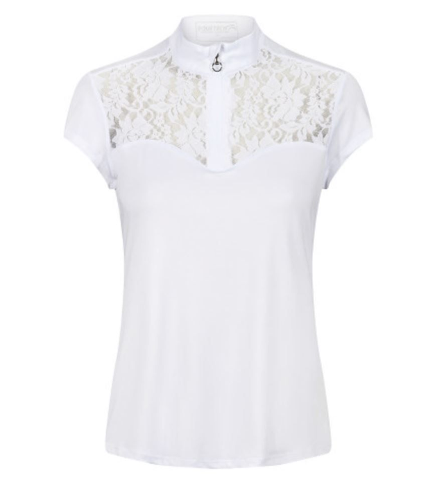 Exquisite lace panelled shirt, which can be concealed with stock. Made from technical stretch fabric. Perfect for competition and casual wear. Features a stock (ratcatcher) collar with zip for ease of use and sweat heart cut to bust, loop to back of neck and scooped back hem.