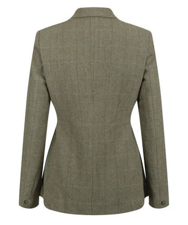 Exclusive Equetech Green herringbone cloth with flap pockets and concealed zip pockets. Rich Gold lining and self fabric collar and pocket welts. Foxhead buttons and double back vents. Dry clean only.